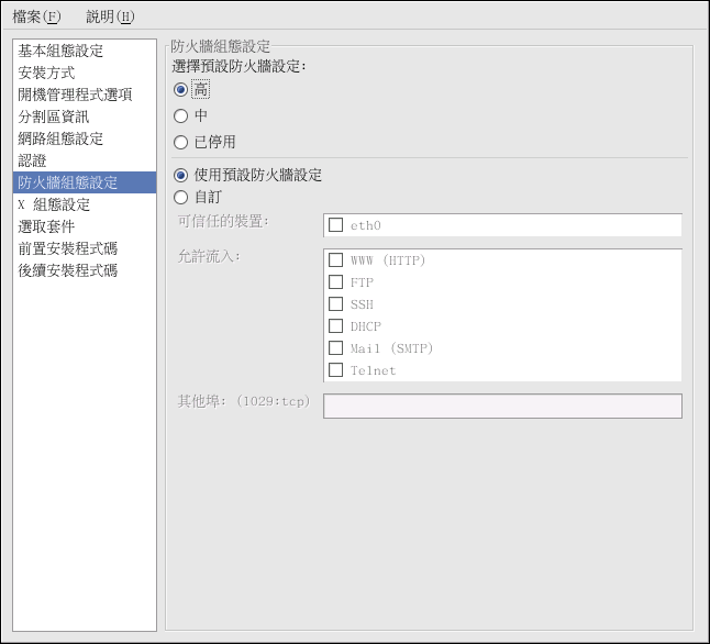 『防火牆組態設定』 的視窗與 Red Hat Linux 安裝程式中的畫面以及 安全等級設定工具 的畫面一樣,並且含有相同的功能性。 請在 『高』、『中』 以及 『已停用』 的安全性等級中做選擇,參考 菴 13.1 節 以取得關於這些安全性等級的詳細資訊。