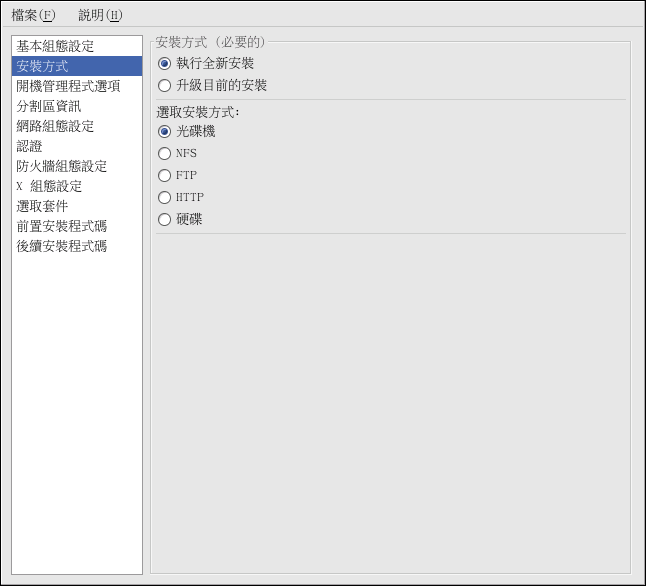 『安裝方式』 的畫面讓您選擇是否要執行一個全新的安裝或系統升級,假如您選擇要做系統升級,『分割區資訊』 與 『選取套件』 的選項將會失效,kickstart 的升級安裝並不支援它們。