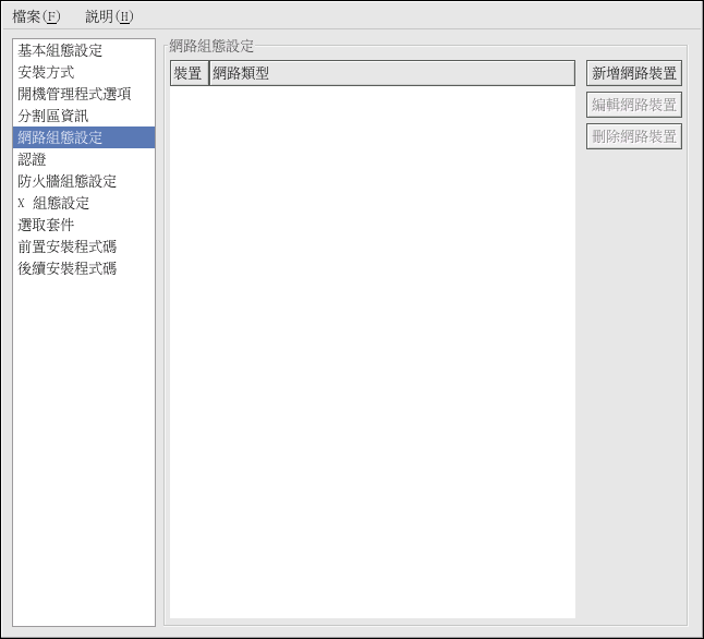 假如要使用 kickstart 來安裝的系統沒有乙太網路卡,請勿在 『網路組態設定』 頁面設定一個。