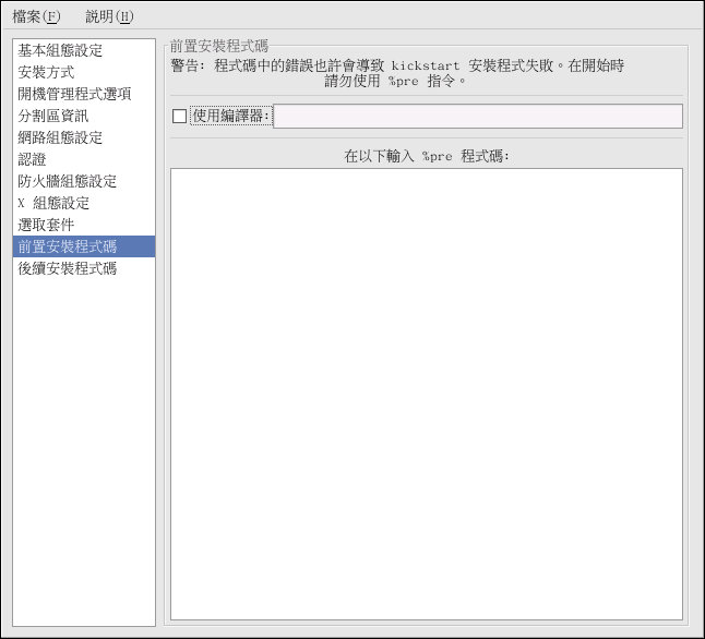 在解析 kickstart 檔案之後與開始安裝之前,您可以增加要在系統上立即執行的指令。 假如您在 kickstart 檔案中有設定網路資訊,在處理這個部份之前便已經啟動網路了。 如要加入一個前置安裝的程式碼,請在文字區域輸入。