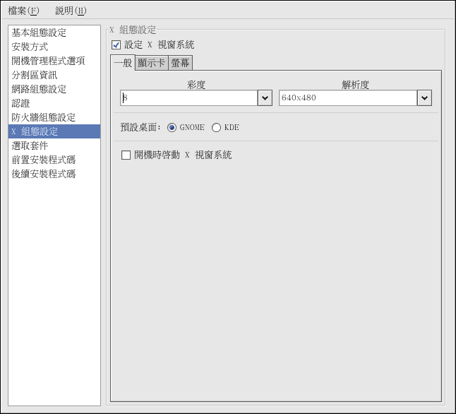 假如您要安裝 X 視窗系統,您可以在 kickstart 安裝中來設定它,只要在如 圖形 8-11 所示的 『X 組態設定』 視窗中選取 『設定 X 視窗系統』 的選項即可。 假如沒有選擇這個選項,將會停用 X 組態設定的選項,而且將會寫入 skipx 的選項到 kickstart 檔案中。