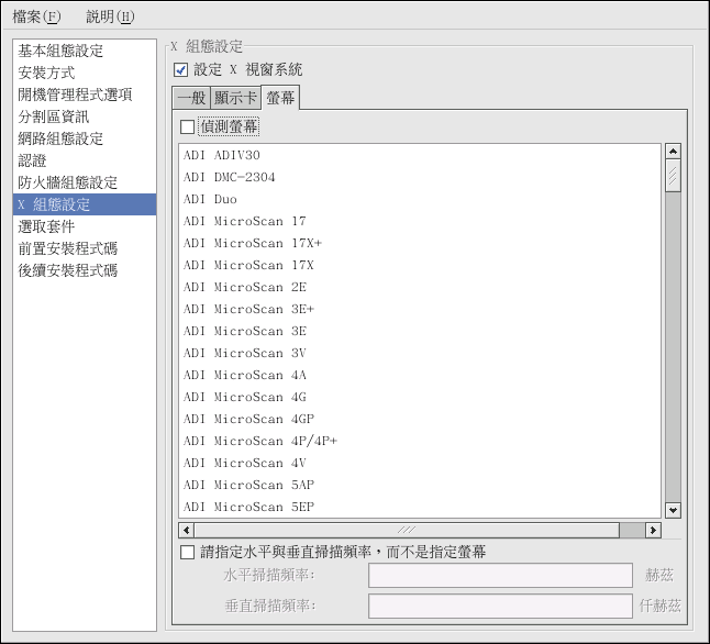 或者您可以從清單中選取您的螢幕,您也可以選取 『請指定水平與垂直掃描頻率,而不是指定螢幕』 選項來指定水平與垂直掃描頻率,而不用選取一個特定的螢幕。 當系統的螢幕沒有出現在清單中時,您可以使用這個選項。 請注意當啟用這個選項時,螢幕的清單將會失效。