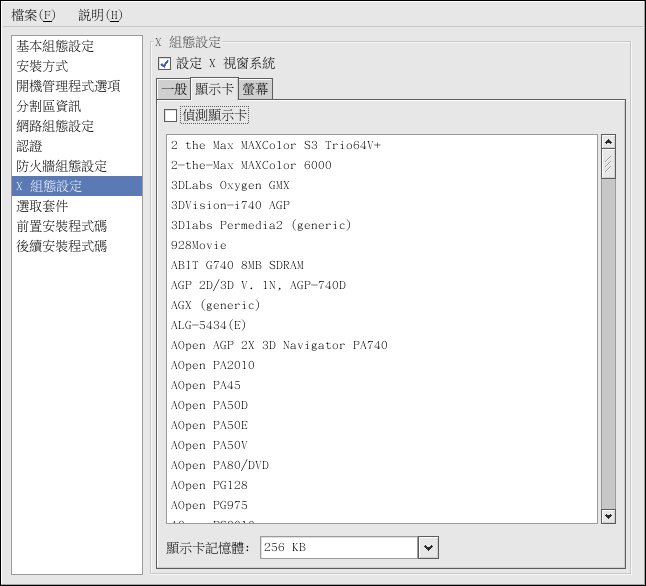 或者您可以從如 圖形 8-12 所示的 『顯示卡』 標簽頁中的清單選取您的顯示卡。 再從 『顯示卡記憶體』 的下拉式選單中指定所選取之顯示卡上的記憶體容量,安裝程式將使用這些數值來設定 X 視窗系統。