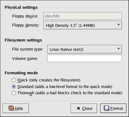 To start gfloppy, choose Main Menu => System Tools => Floppy Formatter. From a shell prompt, type /usr/bin/gfloppy. As shown in Figure 4-2, the gfloppy interface is small and has few options. The default settings are sufficient for most users and needs; however, you can format your diskette with an MS-DOS file system type if necessary. You can also choose the density of your diskette (if you are not using the usual high density 3.5" 1.44MB diskette). You can also elect to quick format the diskette if it was previously formatted as ext2.