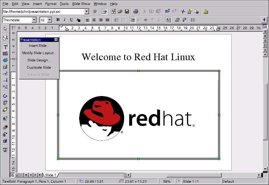 Red Hat Linux includes several tools for managing all of your documents. Whether you are preparing for a business or school presentation, writing a formal letter, or opening a document from an email attachment, Red Hat Linux has a tool that suits your needs.
