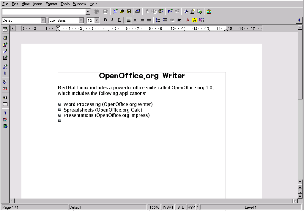 Red Hat Linux includes a powerful business productivity suite called OpenOffice.org, which incorporates several complementary applications into one integrated package. Using OpenOffice.org is much faster and easier than learning complex tags and code to format your documents and presentations. It allows you complete control over the layout and content of your documents and lets you see the results as you edit it. This real-time, visual form of document formatting is called what you see is what you get (or WYSIWYG) editing.