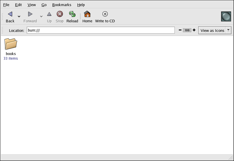 CD Creator allows you to drag and drop files from a Nautilus window to the CD Creator interface. To access the CD Creator feature in Nautilus, insert a blank CD-R(W) into your drive and the CD Creator window will automatically display. You can also double click your home directory icon from the desktop and choose Go => CD Creator from the window menus. You can also type burn: in the Location bar to start CD Creator.