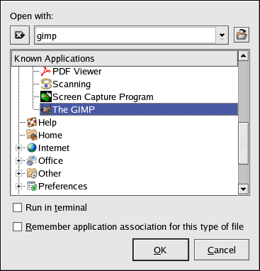 You can also open the image with more advanced image viewers, as well as with The GIMP. Right-click on the image, choose Open With..., then Other.... A pop-up menu will appear allowing you to open the application you wish to use. To launch the GIMP, choose Graphics and scroll down the list of applications. Click on the GIMP icon and click OK, as seen in Figure A-14.