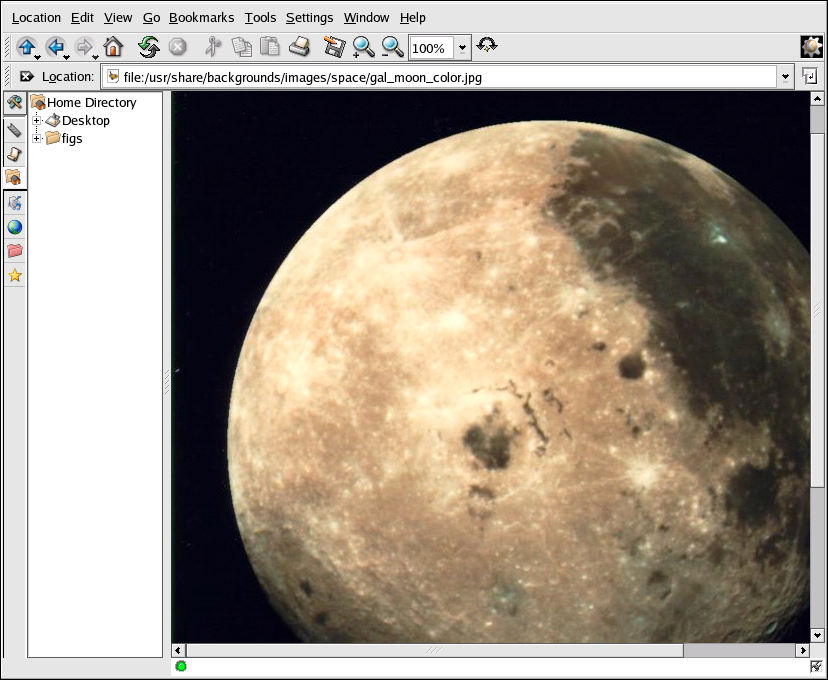 Using Konqueror as an image browser works similarly to Nautilus (see Chapter 11 Working with Images for more information). Image files automatically generate thumbnail image icons for you to preview within the file browser window. When you double-click on a thumbnail icon, the browser displays the image in its native size, as shown in Figure A-12.