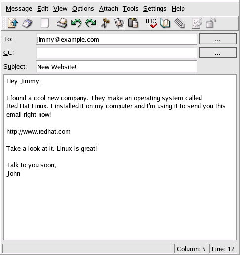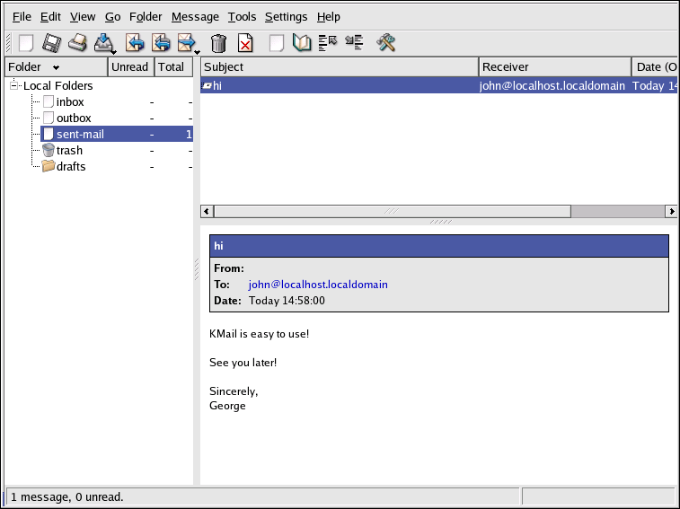 Once you have your email settings configured, you can begin sending and receiving email. The folders on the left side of the KMail screen allow you to view emails you have received, emails ready to be sent, emails you have sent, and more.