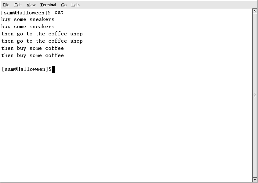 For example, using cat by itself outputs whatever you input to the screen as if it were repeating the line you just typed. The following example shows cat repeating every line that is entered: