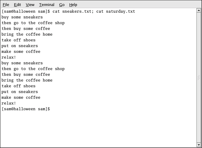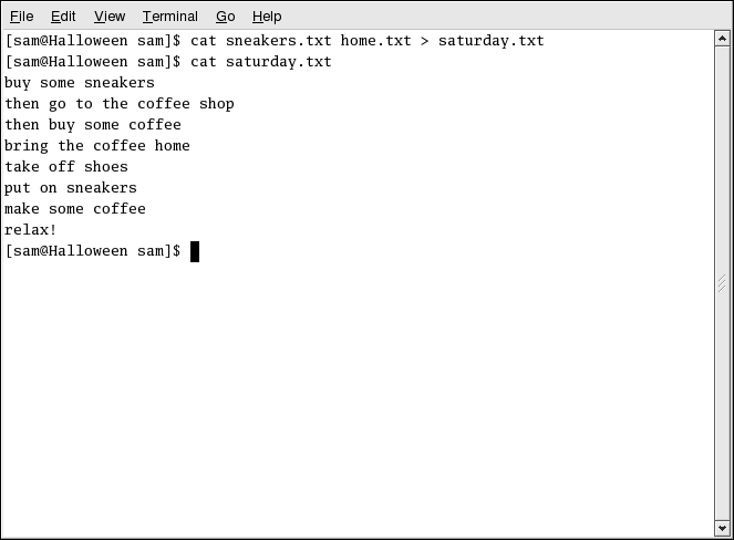 Next, use cat to join home.txt with sneakers.txt and redirect the output of both files to a brand new file called saturday.txt (you will find an example in Figure 13-7). Type the following: