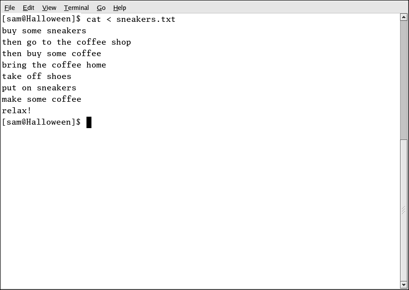 Do you notice anything different in Figure 13-6? There are no repeated entries. That is because the standard output from cat was redirected. That redirection was to a brand new file you made called sneakers.txt.