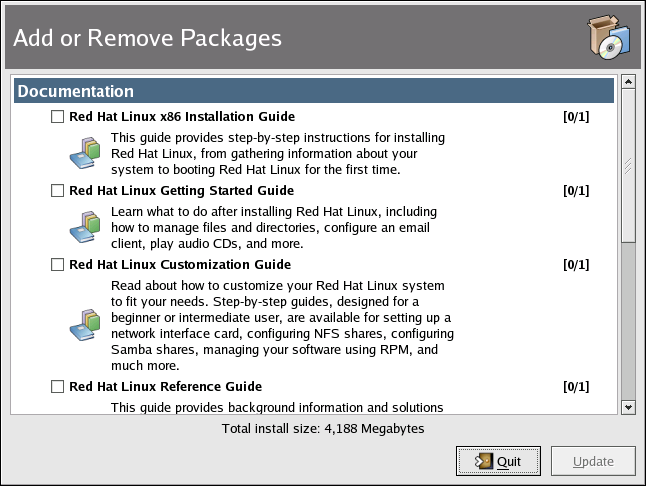 If you have the Red Hat Linux boxed set, remember to take a look at the Red Hat Linux Documentation CD. All of the Red Hat Linux manuals are on this CD. Individual downloads of our documentation in HTML, RPM, PDF, and compressed tarball format (.tar.gz) are also available at http://www.redhat.com/docs/. Once you have logged in to your user account, inserting the Documentation CD in your CD-ROM drive should automatically start the Package Management Tool and allow you to install any of the Red Hat Linux documentation. Follow the instructions and choose the documentation you would like to install.