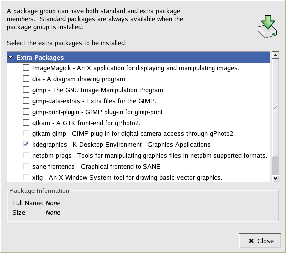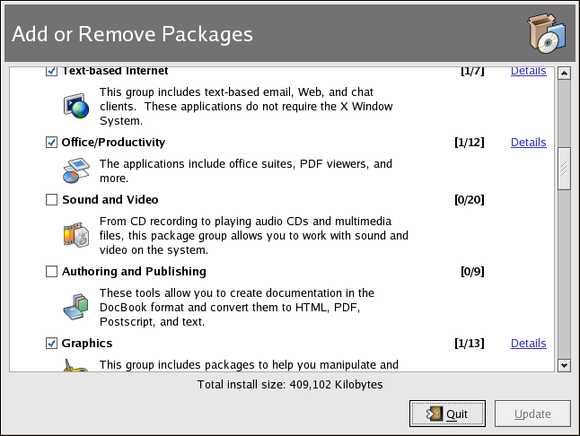 The Package Management Tool marks what packages are already installed on your system with a checkmark. You can add packages by clicking the checkbox next to each package. To uninstall a package, remove the checkmark (see Figure 15-4).