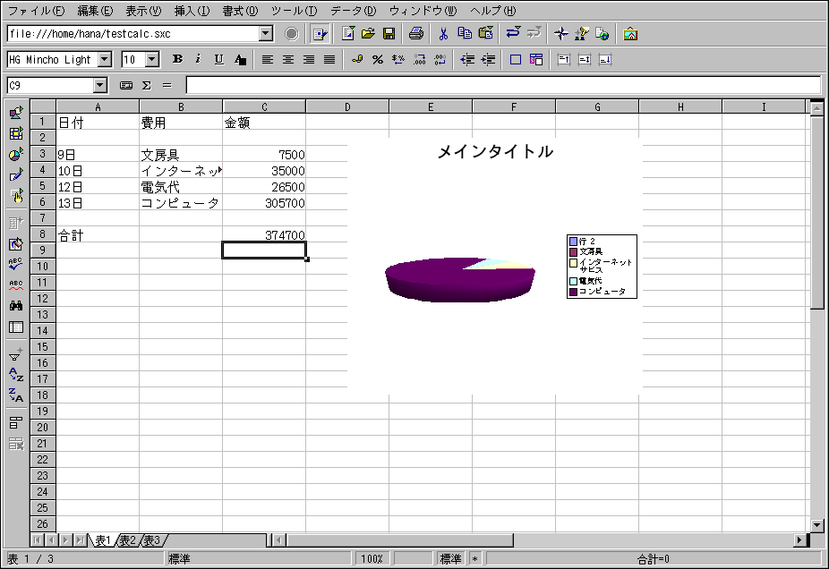 学校の授業あるいはビジネス上でのプレゼンテーションに 使用する表やグラフが必要な場合は、OpenOffice.org から数種類の表とグラフのテンプレートが選べます。 表にしたい区域をハイライトして、挿入 => グラフ...の順にクリックします。 グラフのウィンドウでは、選択したデータ 範囲がテキストボックスに表示されます。必要であればカスタマイズ できます。次へをクリックすると、データを 使って作成できるいろいろな表とグラフが表示されます。好みの スタイルを選び、完了をクリックします。 グラフが表計算ウィンドウ内にアンカー印付きで表示されます。 印刷用にスクリーン上のどこにでも移動できます。また、グラフを オブジェクトとして保存してOpenOffice.org Writer のドキュメントやOpenOffice.org Impress のプレゼンテーションに埋め込むことができます。