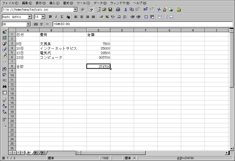大企業からホームオフィスに至るまで、事業の種類を問わず 表計算は記録保存、ビジネスチャート作成、データ処理などに使用 されています。OpenOffice.org Calc は表計算ソフトで、行と列で構成されたセル データを入力、処理することができます。ひとつのセルは、例えば、 数量、ラベル、計算式などデータの一片を収容する容器です。 セル群に対して計算を行なったり(一行内の複数のセルを加算 あるいは引算をするなど)、セル群に含まれる数量を基にしてチャート を作成することなどができます。ドキュメントに計算表を 組み込んでプロ仕様の仕上がりにすることもできます。