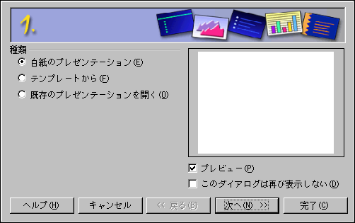 はじめてOpenOffice.org Impress を開始するときは、オートパイロットが表示されます。スライドの スタイル、スライドを発表するときに使用する媒体(普通紙、 プロジェクタ用透明シート、スライド、ディスプレイモニタなど)、 ご使用のコンピュータからプレゼンテーションを実行する場合には スライドに適用したい動画の視覚効果、などが選択できます。