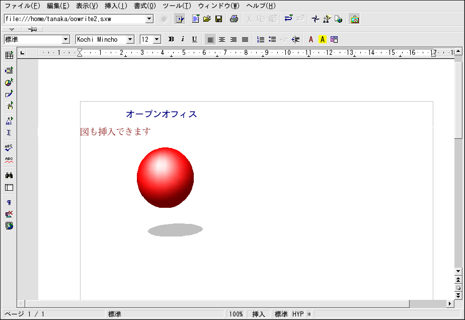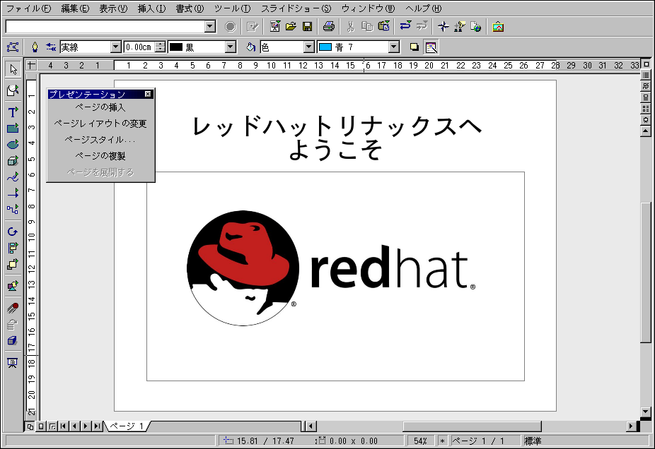 Red Hat Linux にはOpenOffice.orgと呼ばれる ビジネスにおいて生産性の高いオフィススイートが入っています。 これは数種の相補型アプリケーションを1つの統合パッケージに まとめたものです。OpenOffice.org を使用するとドキュメントやプレゼンテーションをフォーマットする ために複雑なタグやコードを学ぶより、ずっと早く簡単に作業が できます。ドキュメントのレイアウトや内容を自在に操作すること ができ、編集しながら結果を見ることができます。このリアルタイム でビジュアル形式のドキュメントフォーマットは what you see is what you get(又は省略形で WYSIWYG)編集と呼ばれます。