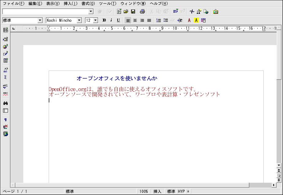 デスクトップパネルからOpenOffice.org Writer をスタートするには、メインメニュー => オフィス => OpenOffice.org Writerの順で選択 します。シェルプロンプトからスタートする場合は、 oowriterとタイプします。