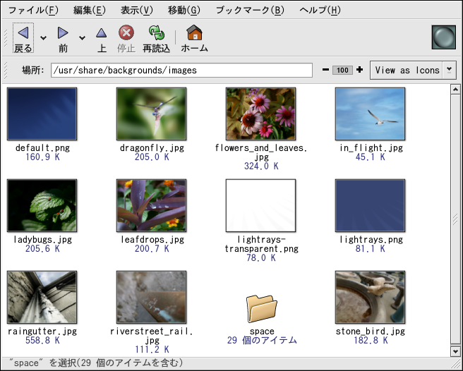 Nautilusはグラフィカル デスクトップ環境用の全般用途型ファイルマネジャ兼ブラウザ です。Nautilusは単純なイメージ 表示以外にも多くの機能を持ちますが、このセクションでは 基本的なイメージブラウザとして使用します。 Nautilusの詳細については 第2章をご覧ください。