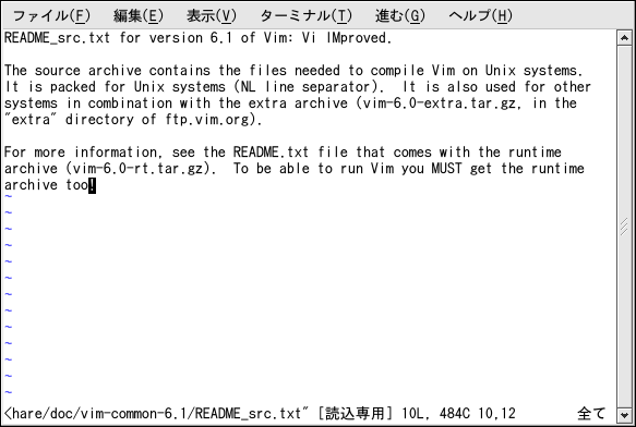 グラフィカルデスクトップを使用していないユーザーがテキスト ファイルや設定ファイルを読む、変更する作業を行ないたい場合、 Red Hat Linuxにはvi (ヴィ-アイ と読む)テキストエディタが備わっています。 viは シンプルなアプリケーションで、 シェルプロンプト内で開きます。このアプリケーションでテキスト ファイルを見る、検索する、変更することができます。 viを開始するには、シェルプロンプトでvi と入力します。viでファイル を開くには、シェルプロンプトでvi< ファイル名>と入力します。