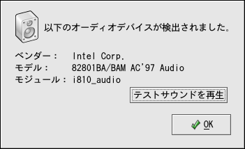 サウンドカード設定ツール ユーティリティは システムの中のサウンドカードを探します。ユーティリティが プラグアンドプレーのサウンドカードを見つけた場合、自動的に そのカード用に適切な設定をしようとします。それから テストサウンドを再生ボタンを押してサンプル音を ならしてみてください。そのサンプル音が聞こえればOK を選択してサウンドカード設定を終了します。