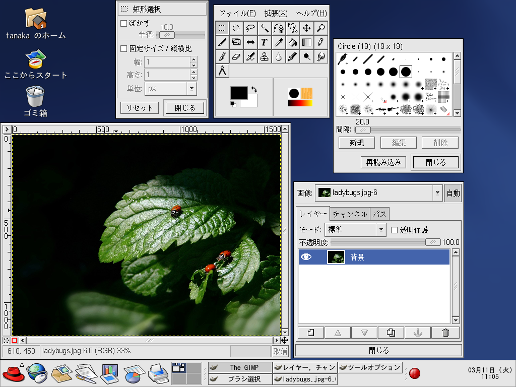 GIMPを使用する には、基本を少し知っておく必要があります。シェル プロンプトから、gimpコマンドを 使ってGIMPを起動するか、 メインメニュー => グラフィックス =>GIMP の順に選んで起動することもできます。