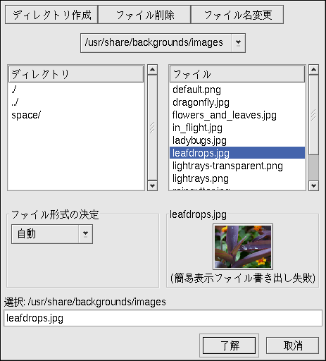 選択したファイルがダイアログの底辺近くの選択 フィールドに現れます。サムネイルのプレビューがダイアログ に表示されるか、あるいは、 プレビューの生成 ボタンが表示されます。イメージのサムネイルを見たい場合は プレビューの生成ボタンをクリックします。