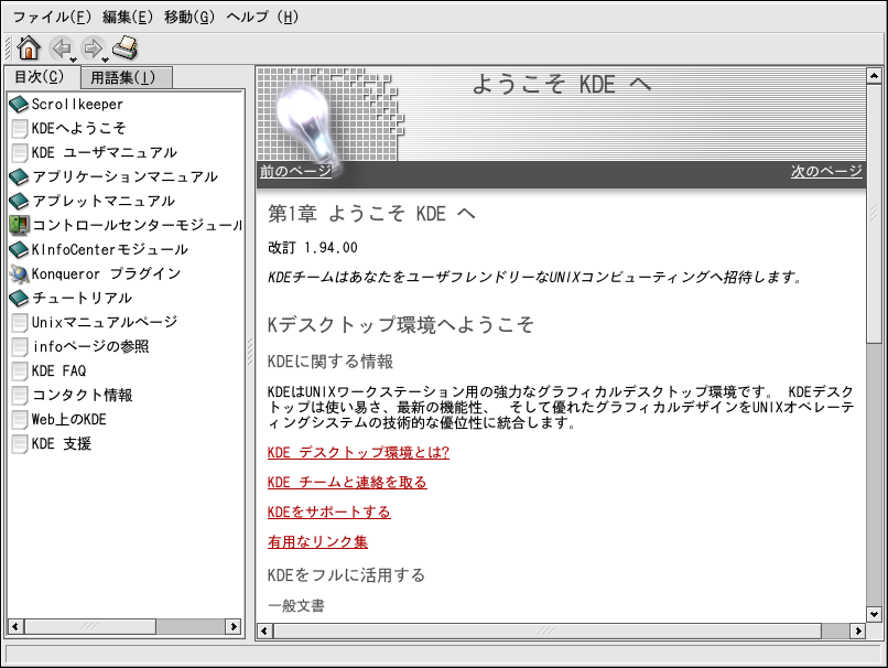 ヘルプセンターブラウザの 開始画面は、図A-1のように 表示されます。このメインページから、デスクトップの使用法や 設定、KDEに含まれている数多くのアプリケーションでの作業、 Konquererファイルマネージャでの 作業などのトピックに関するヘルプドキュメントを表示すること ができます。