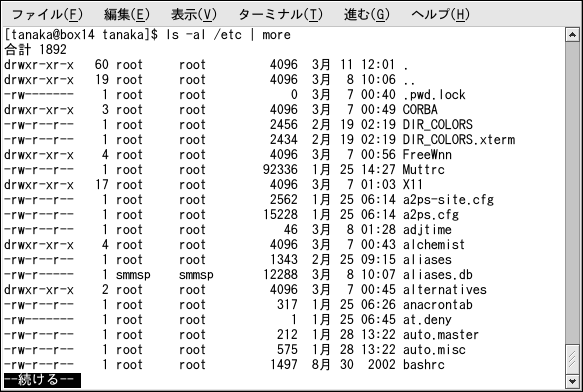 これで、/etcの内容を一度に一画面ずつ 表示できます。画面を前進するには [Space]キーを押して、 画面を戻るには、[B]キーを押し、終了するには、 [Q]キー押します。別の方法として、矢印キーを使用して less内で移動することができます。