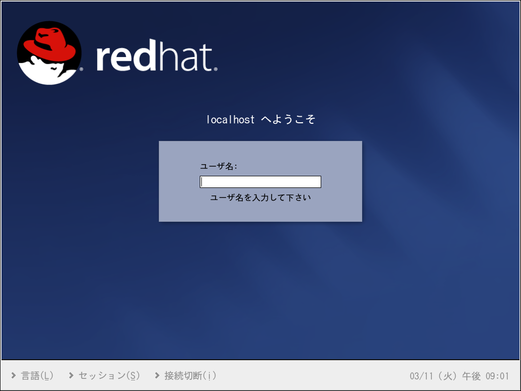 Red Hat Linuxシステム使用の次のステップはログインです。 ログインはユーザーがシステムに自己紹介をするものです (認証とも呼ばれる)。間違った ユーザー名やパスワードを入力するとシステムへのアクセス を許可されません。