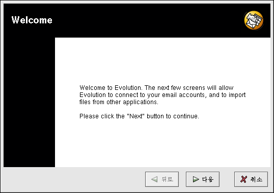 EvolutionÀ» óÀ½À¸·Î ½ÃÀÛÇϽøé, ȯ¿µ ȸéÀÌ ³ªÅ¸³¯ °ÍÀÔ´Ï´Ù. (±×¸² 7-1) ÀÌ È¯¿µ ȸ鿡¼ À̸ÞÀÏ Á¢¼ÓÀ» ¼³Á¤ÇÏ½Ç ¼ö ÀÖ½À´Ï´Ù. ȸ鿡 ³ªÅ¸³ Áö½Ã »çÇ×À» µû¶ó¼ ISP¿Í ³×Æ®¿ö °ü¸®ÀÚ¿¡°Ô¼ ¾òÀº Á¤º¸¸¦ Á¦°øµÈ ÅØ½ºÆ® »óÀÚ¿¡ ±âÀÔÇØ ÁֽʽÿÀ. ±âÀÔÀ» ¸¶Ä¡½Å ÈÄ ¸¶Ä§ ¹öưÀ» Ŭ¸¯ÇÏ½Ã¸é ±×¸² 7-2°ú °°Àº ÁÖ È¸éÀÌ ³ªÅ¸³¯ °ÍÀÔ´Ï´Ù.