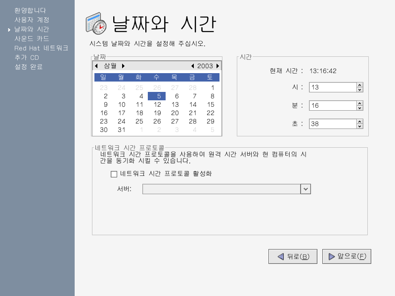 Red Hat Linux ½Ã½ºÅÛÀ» óÀ½À¸·Î ½ÃÀÛÇϽøé, Red Hat Linux ¼³Á¤À» µµ¿ÍÁÖ´Â ¼³Á¤ ¿¡ÀÌÀüÆ®°¡ ³ªÅ¸³¯ °ÍÀÔ´Ï´Ù. ¼³Á¤ ¿¡ÀÌÀüÆ®¸¦ »ç¿ëÇÏ¿© ½Ã½ºÅÛ ½Ã°£°ú ³¯Â¥¸¦ ¸ÂÃß°í, ¼ÒÇÁÆ®¿þ¾î¸¦ ¼³Ä¡Çϸç Red Hat Network¿¡ ¿©·¯ºÐÀÇ ½Ã½ºÅÛÀ» µî·ÏÇÏ´Â µîÀÇ ½Ã½ºÅÛ ¼³Á¤ ÀÛ¾÷À» ¼öÇàÇÏ½Ç ¼ö ÀÖ½À´Ï´Ù. ¼³Á¤ ¿¡ÀÌÀüÆ®°¡ ½Ã½ºÅÛ ¼³Á¤À» µµ¿ÍÁÖ´Â ´öºÐ¿¡ ¿©·¯ºÐÀº Red Hat Linux¸¦ ¼Õ½±°í Àçºü¸£°Ô »ç¿ëÇÏ½Ç ¼ö ÀÖ½À´Ï´Ù.