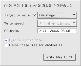 CD-R(W)¿¡ ÆÄÀÏÀ» ÀúÀåÇÒ Áغñ°¡ µÇ¼Ì´Ù¸é, CD Creator â¿¡¼ Write to CD ¹öưÀ» Ŭ¸¯ÇϽʽÿÀ. ±â·Ï ¼Óµµ, CD À̸§ ¹× ´Ù¸¥ ¿É¼ÇÀ» ¼³Á¤ÇÒ ¼ö ÀÖ´Â ´ëÈ »óÀÚ°¡ ³ªÅ¸³¯ °ÍÀÔ´Ï´Ù.