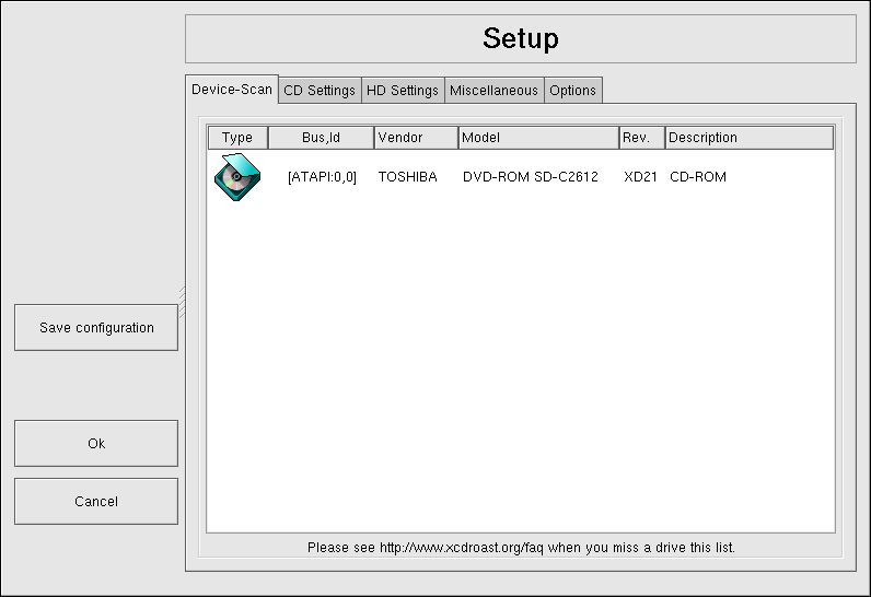 X-CD-Roast¸¦ ½ÃÀÛÇÏ·Á¸é, ÁÖ ¸Þ´º => ½Ã½ºÅÛ µµ±¸ => CD Writer¸¦ ¼±ÅÃÇϽʽÿÀ. ÇÁ·ÒÇÁÆ®¿¡¼´Â /usr/bin/xcdroast ¸í·ÉÀ» ÀÔ·ÂÇÏ½Ã¸é µË´Ï´Ù. X-CD-Roast´Â ¸ÕÀú ÀåÄ¡ ¹ö½º¸¦ ½ºÄµÇÏ¿© CD-R(W) µå¶óÀ̺긦 ã½À´Ï´Ù. ±× ÈÄ CD-writer, CD-ROM°ú ±× ¿ÜÀÇ °Í¿¡ ´ëÇÑ ¼ÂÆÃÀ» ¼³Á¤ÇÒ ¼ö ÀÖ½À´Ï´Ù. ±×¸² 4-8´Â ¼³Á¤ ȸ鿡 ³ªÅ¸³ ¼³Á¤ ¿É¼ÇÀ» º¸¿©ÁÖ°í ÀÖ½À´Ï´Ù. ¿©·¯ºÐÀÌ °¡Áö°í °è½Å CD-R(W) µå¶óÀ̺êÀÇ Á¦Ç°¸íÀº ±×¸²¿¡ ³ª¿Â µå¶óÀ̺ê¿Í ´Ù¸¦ ¼öµµ ÀÖ½À´Ï´Ù.