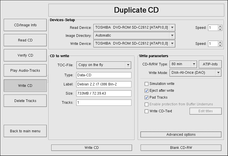 cdrecord À¯Æ¿¸®Æ¼´Â ¼Óµµ, ÀåÄ¡¿Í µ¥ÀÌÅÍ ¼³Á¤°ú °°Àº ¾²±â °úÁ¤ÀÇ ¿©·¯ ±â´ÉÀ» ¼³Á¤ÇØÁÖ´Â ¿É¼ÇÀ» »ç¿ëÇÏ¿© ¿Àµð¿À, µ¥ÀÌÅÍ¿Í È¥ÇÕ ¸ðµå (¿Àµð¿À, ºñµð¿À ¹× µ¥ÀÌÅÍÀÇ Á¶ÇÕ) CD-ROMÀ» ±â·ÏÇÕ´Ï´Ù.