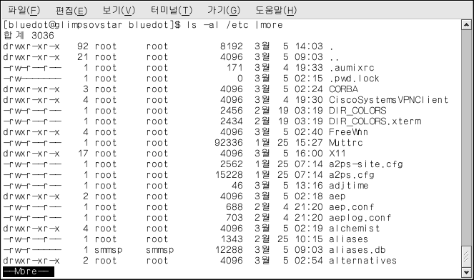 /etc µð·ºÅ丮ÀÇ ³»¿ëÀ» Ãâ·ÂÇϱâ À§ÇØ ls ¸í·É ´ÙÀ½¿¡ moreÀ» »ç¿ëÇÕ´Ï´Ù.