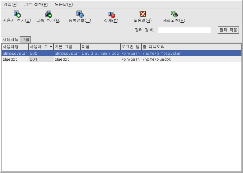 ´Ù¸¥ ¹æ¹ýÀ¸·Î´Â ½© ÇÁ·ÒÇÁÆ®¿¡¼ redhat-config-users ¸í·ÉÀ» ÀÔ·ÂÇÏ¿© »ç¿ëÀÚ °ü¸® ÇÁ·Î±×·¥¸¦ ½ÃÀÛÇÏ½Ç ¼ö ÀÖ½À´Ï´Ù.