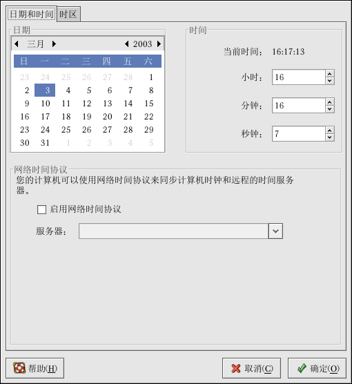 你必须运行 X 窗口系统并具备根特权。要从桌面上启动这个程序,点击「主菜单」 => 「系统设置」 => 「日期 & 时间」,或在 shell(如 XTerm 或 GNOME 终端)提示下键入 redhat-config-date 命令。