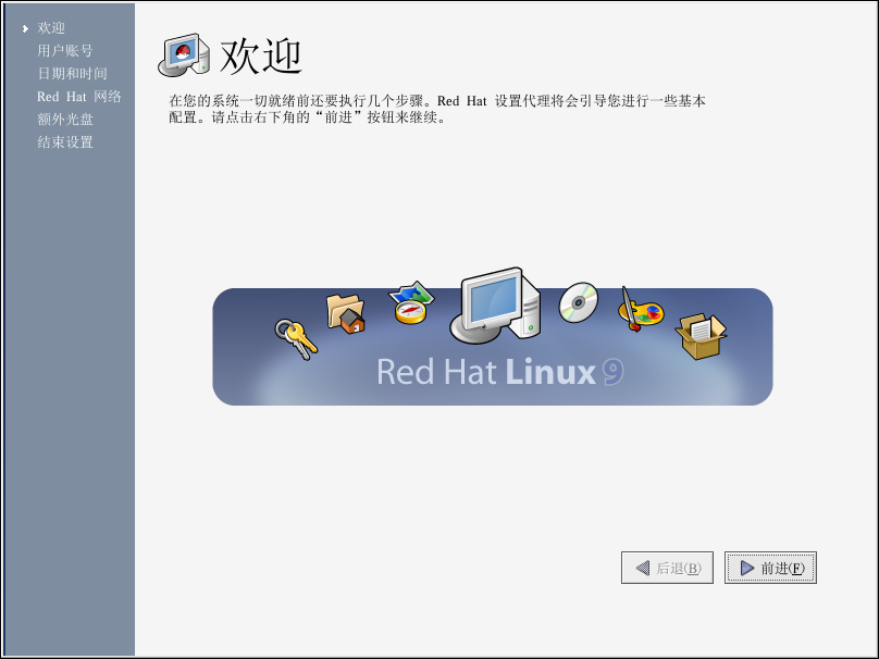 首次启动 Red Hat Linux 机器时,你会看到设置代理,它会引导你进行 Red Hat Linux 系统配置。使用该工具,你可以设置系统的日期和时间;给系统添加用户;安装软件;在 Red Hat 网络中注册机器;以及其它任务。设置代理让你从一开始就配置环境,从而使你能够快速地开始使用 Red Hat Linux 系统。