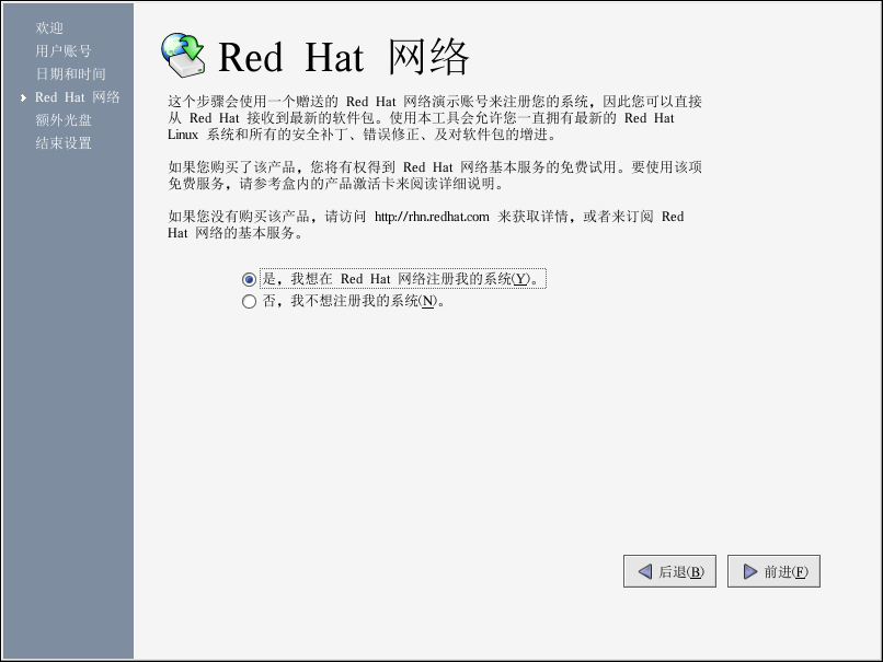 如果你想在 Red Hat 网络注册你的系统并接收关于你的 Red Hat Linux 系统的自动更新,选择「是,我想在 Red Hat 网络注册我的系统」。这会启动Red Hat 更新代理— 一个会引导你进行 Red Hat 网络注册的向导工具。选择「否,我不想注册我的系统」会跳过注册。关于 Red Hat 网络和如何注册机器的详细信息,请参阅以下网站上的 Red Hat 网络文档: http://www.redhat.com/docs/manuals/RHNetwork/。