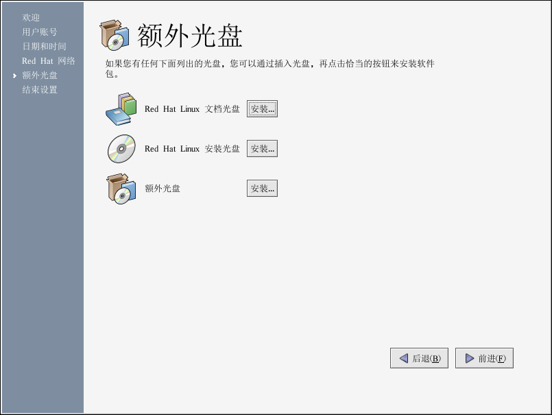 如果你想安装在安装过程中没有安装的 Red Hat Linux RPM 软件包、第三方的软件、或是 Red Hat Linux 文档光盘上的文档,你可以在「额外光盘」屏幕上办到。插入包含你想安装的软件或文档的光盘,点击「安装...」按钮,然后遵循说明。