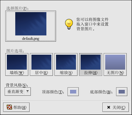 背景首选项工具允许你从所提供的图像目录(/usr/share/backgrounds/images/)中载入一个新背景。你还可以把图像从你自己的图像目录中拖放到这个窗口中。该窗口中还提供了好几种显示图像的方式。「墙纸」选项会在桌面上排列你的图像。 这在你使用小图像的时候,或要使用 /usr/share/backgrounds/tiles/ 或你自己的图像集中的壁砖(tile,或图案)时会很有用。「居中」选项把你的图像放置在桌面正中,并使用默认的背景颜色来填充剩余的桌面空间。要想不平铺图像而使它填满桌面,使用 「缩放」或「拉伸」选项。图 2-11显示了 被拉伸来填满整个桌面的花树背景图像。