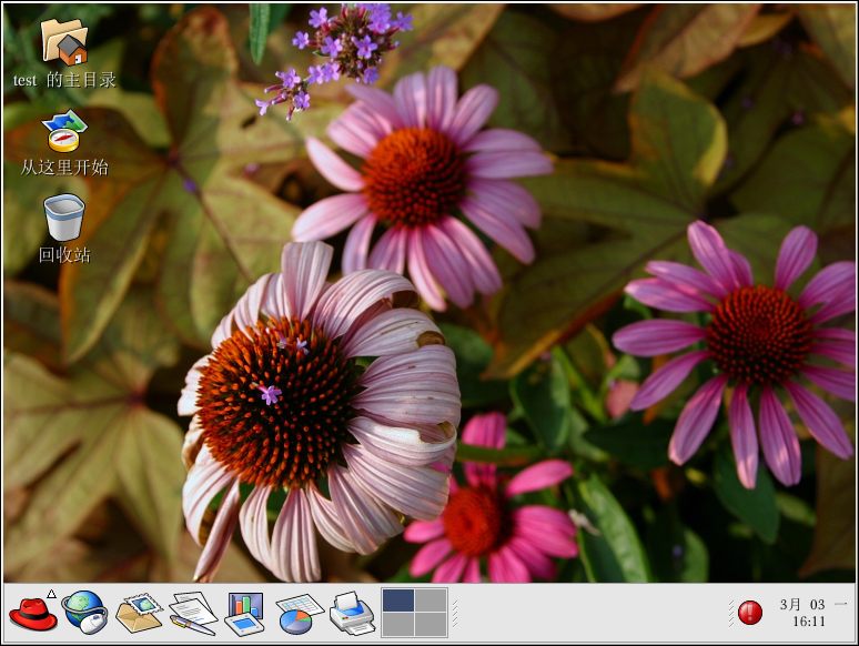 「从这里开始」屏幕中包括了许多图标,这些图标允许你使用你最喜欢的应用程序;编辑桌面首选项;进入「主菜单」项目;使用服务器配置工具;以及编辑系统设置。