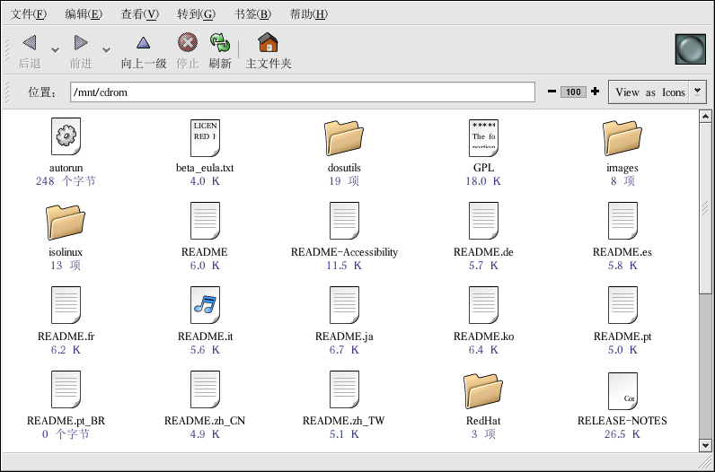 按照默认设置,光盘会被自动挂载,你的文件管理器还会打开一个窗口向你展示该光盘的内容。图 4-4显示了