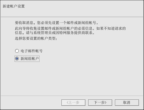 要加入一个新闻组,你首先需要设立一个新闻组帐号。在侧栏内点击你的邮件帐号名,然后从出现在屏幕右侧的选项中选择「新帐户」。「新建帐户设置」屏幕就会出现。选择「新闻组帐户」,然后点击「下一步」。