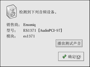 声卡配置工具程序会在你的系统上探测声卡。如果这个工具检测到一个即插即用的声卡,它会自动试图为你的声卡配置正确的设置。你可以点击「播放测试声音」按钮来播放声音示例。如果你听到了声音,选择「确定」,你的声卡配置就完成了。
