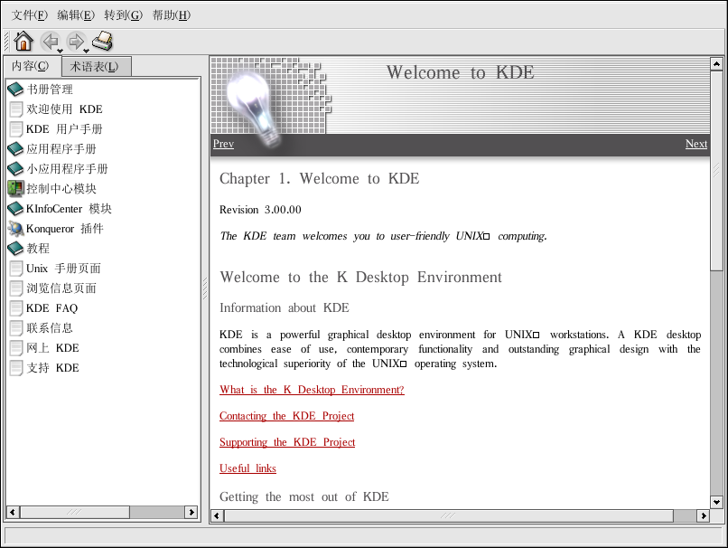 你可以通过帮助中心来阅读关于 KDE 的一组通俗易懂的文档。