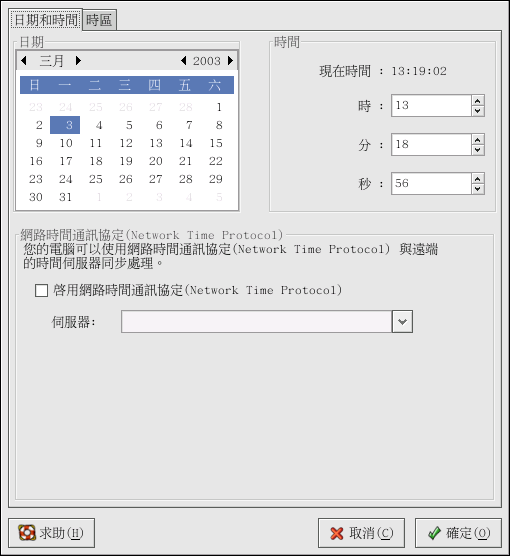 時間與日期設定工具 讓使用者可以更改系統的日期與時間、設定系統所使用的時區以及設定網路時間通訊協定(NTP) 系統程式以使系統的時鐘與一部時間伺服器做同步化。
